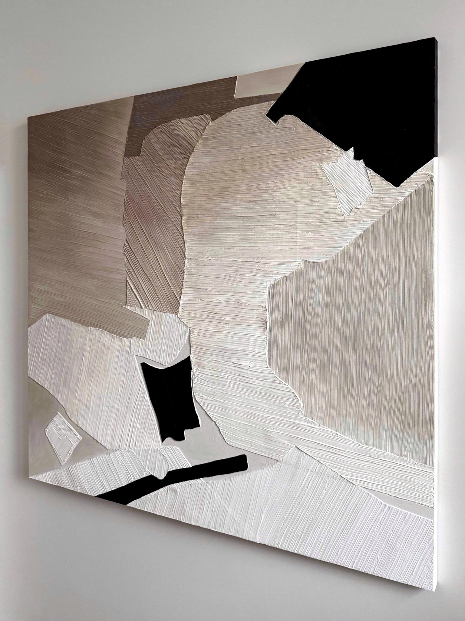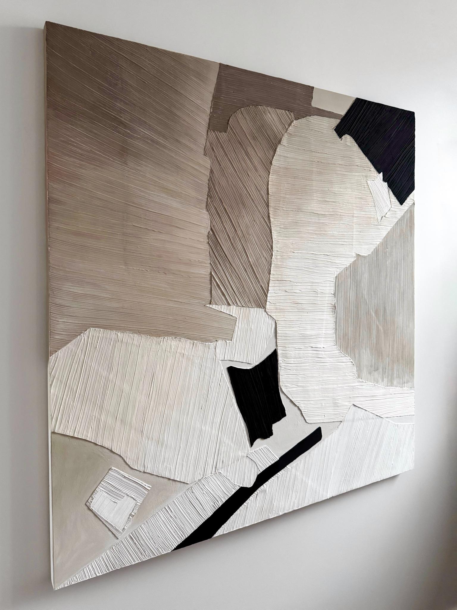 Текстурная картина с эффектом мозаики. Деревянный артборд, текстурная паста, полимерная паста, акрил, матовое покрытие. Поверхность — матовая, цвет — серый, черный, бежевый, белый, молочный, коричневый.