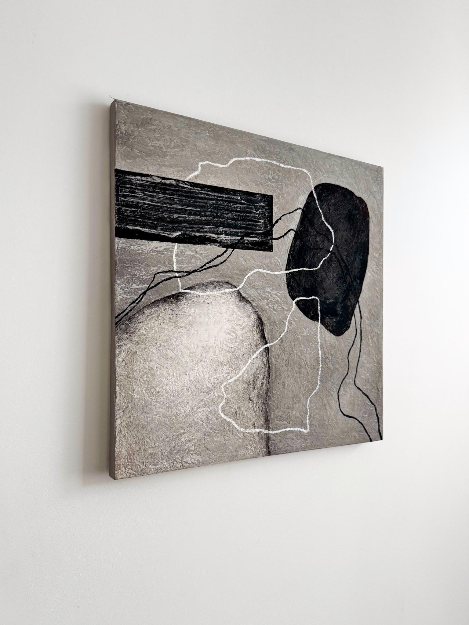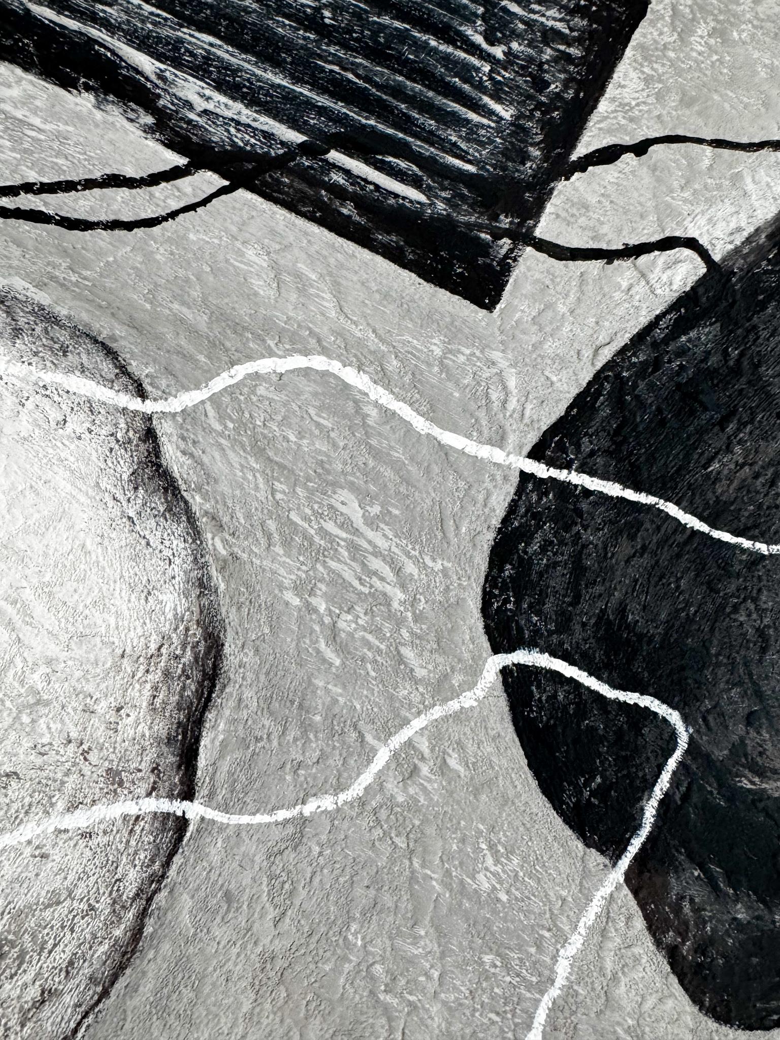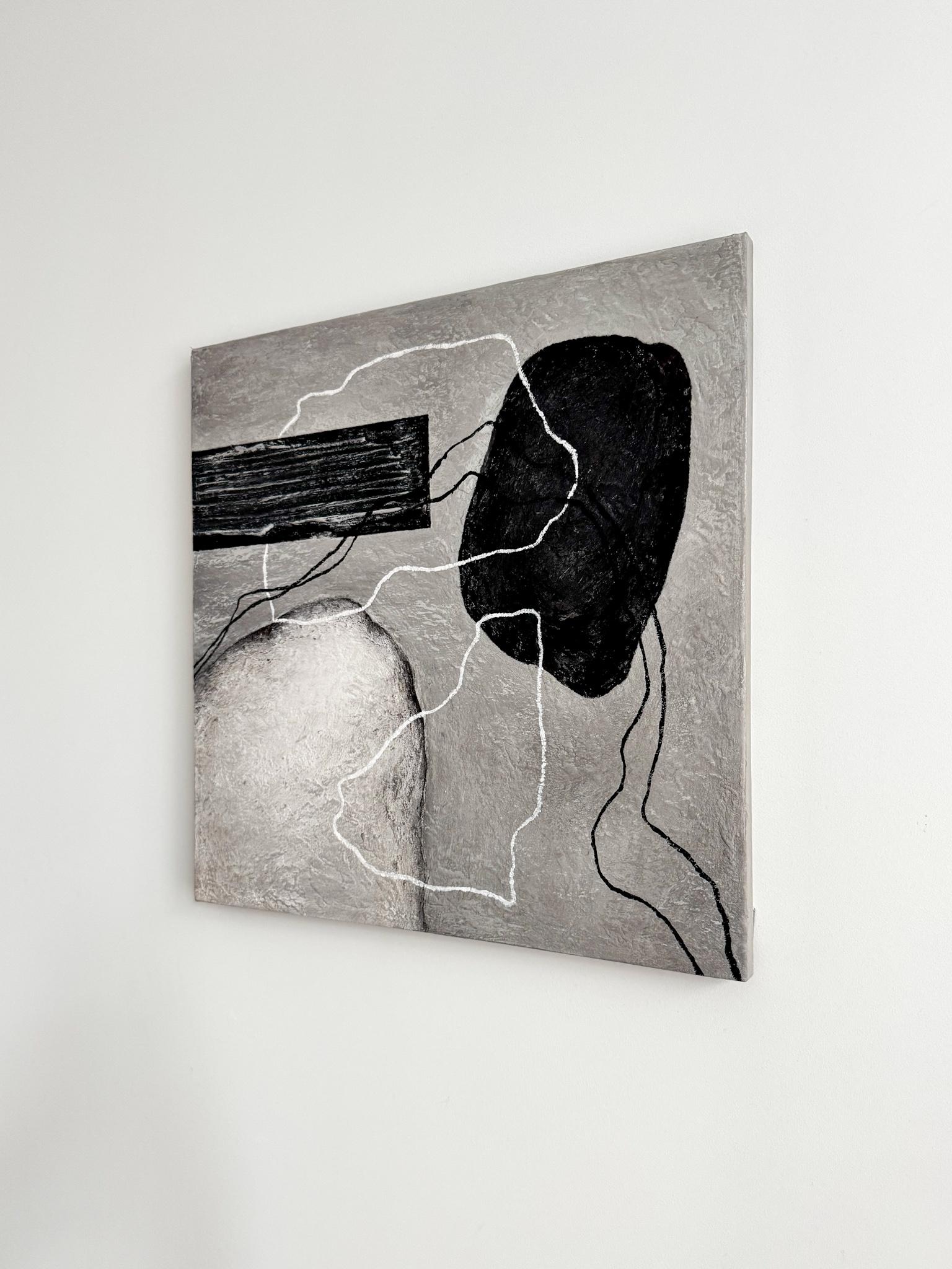 Текстурная картина с эффектом многослойного объема. Холст ручной работы, текстурная паста, акрил, глянцевое финишное покрытие. Поверхность — глянцевая, цвет — серый, черный. белый.
