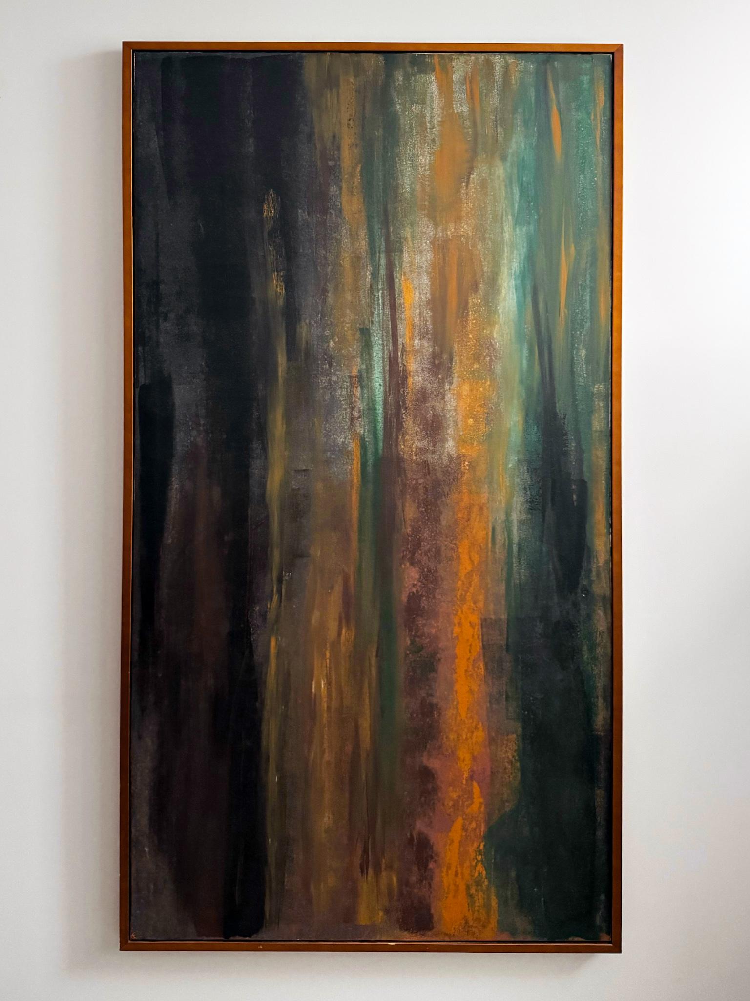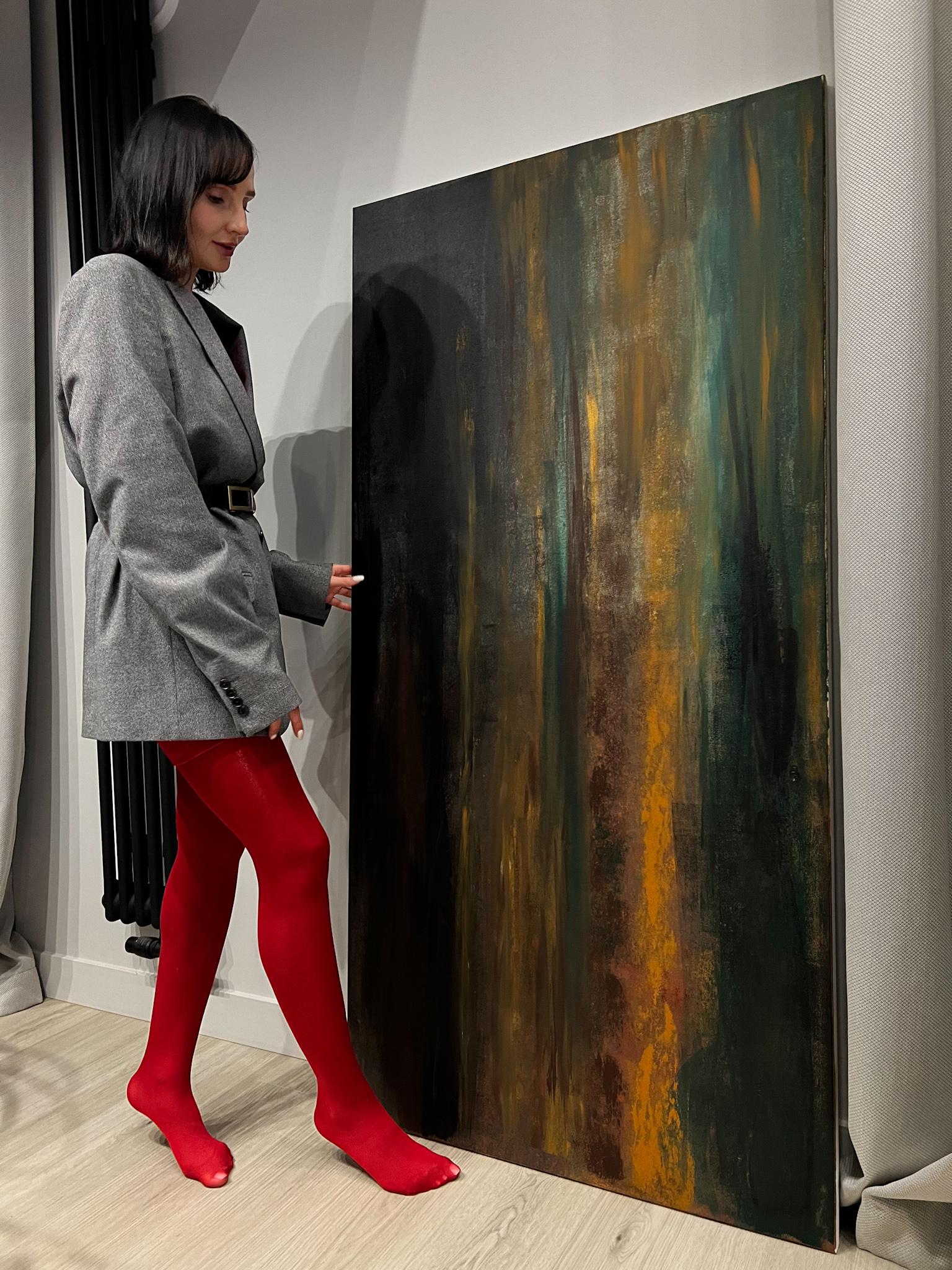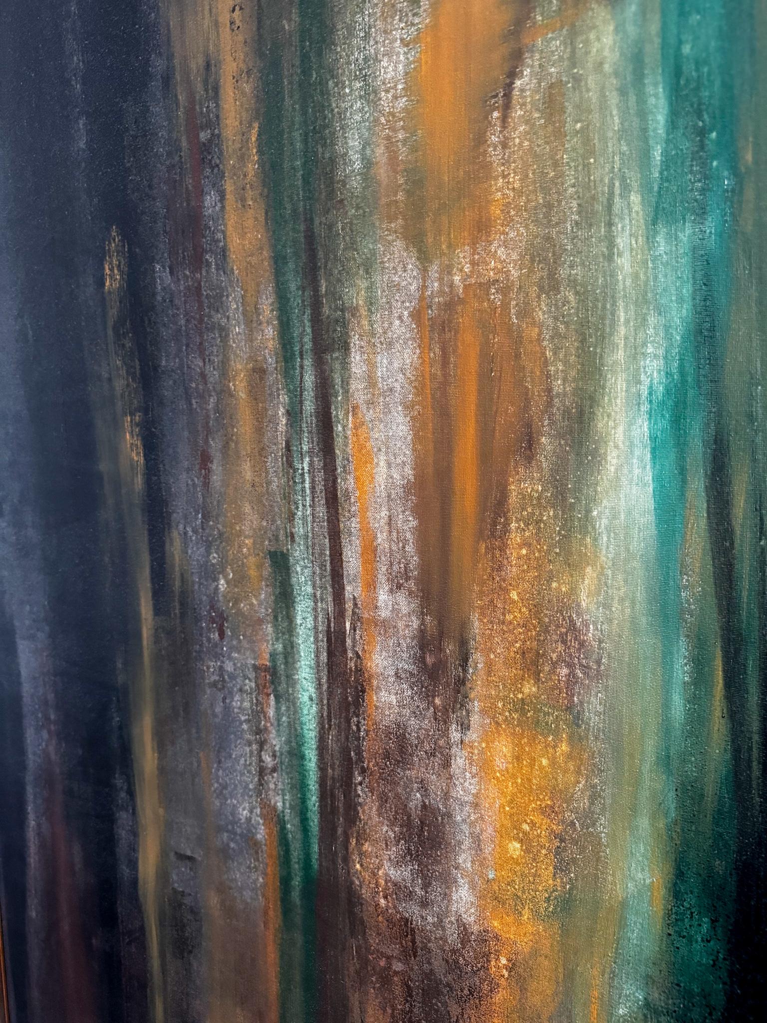 Интерьерная картина на холсте в золотой раме. Холст ручной работы, акрил, деревянная рама. Поверхность — матовая, цвет — зеленый, коричневый, золотой.