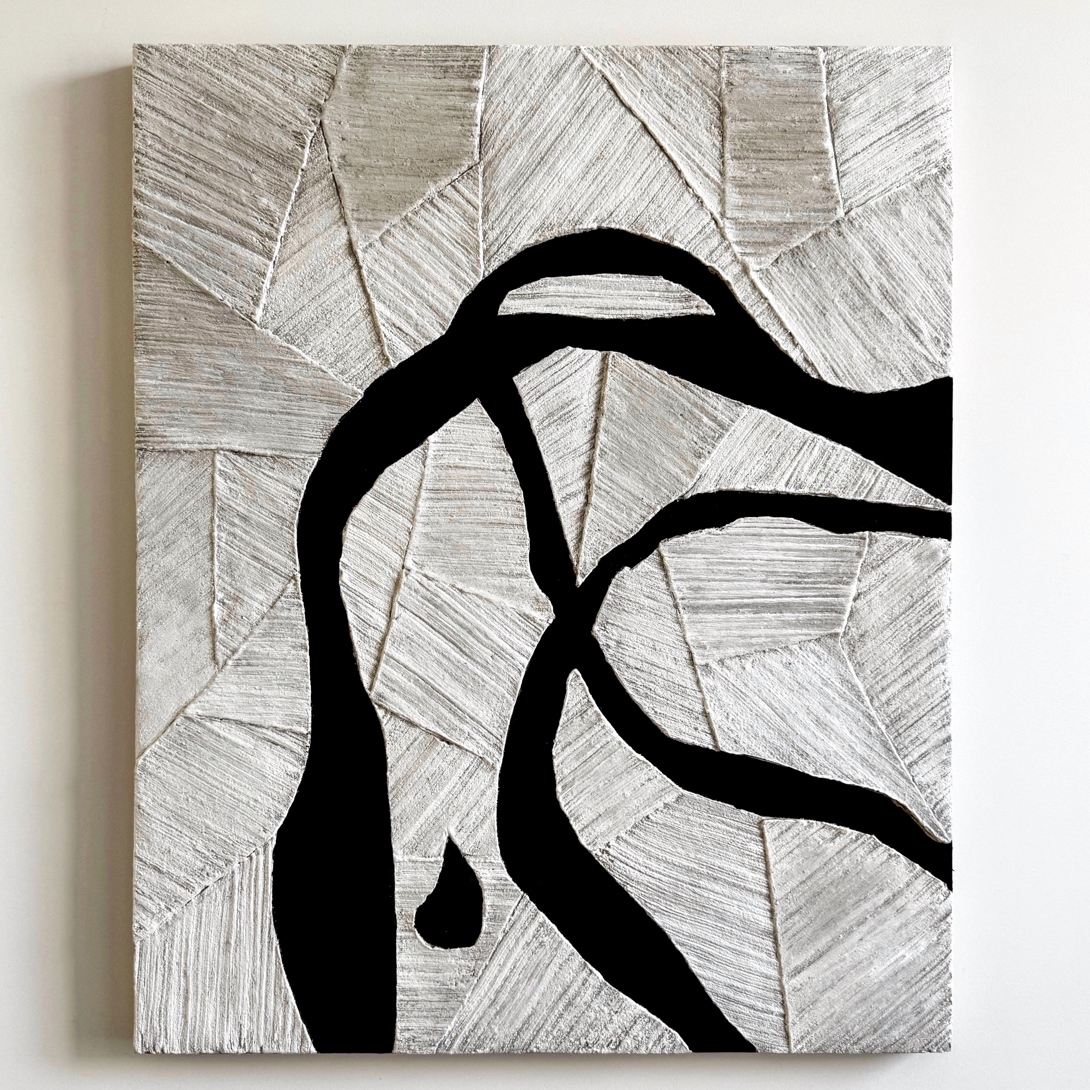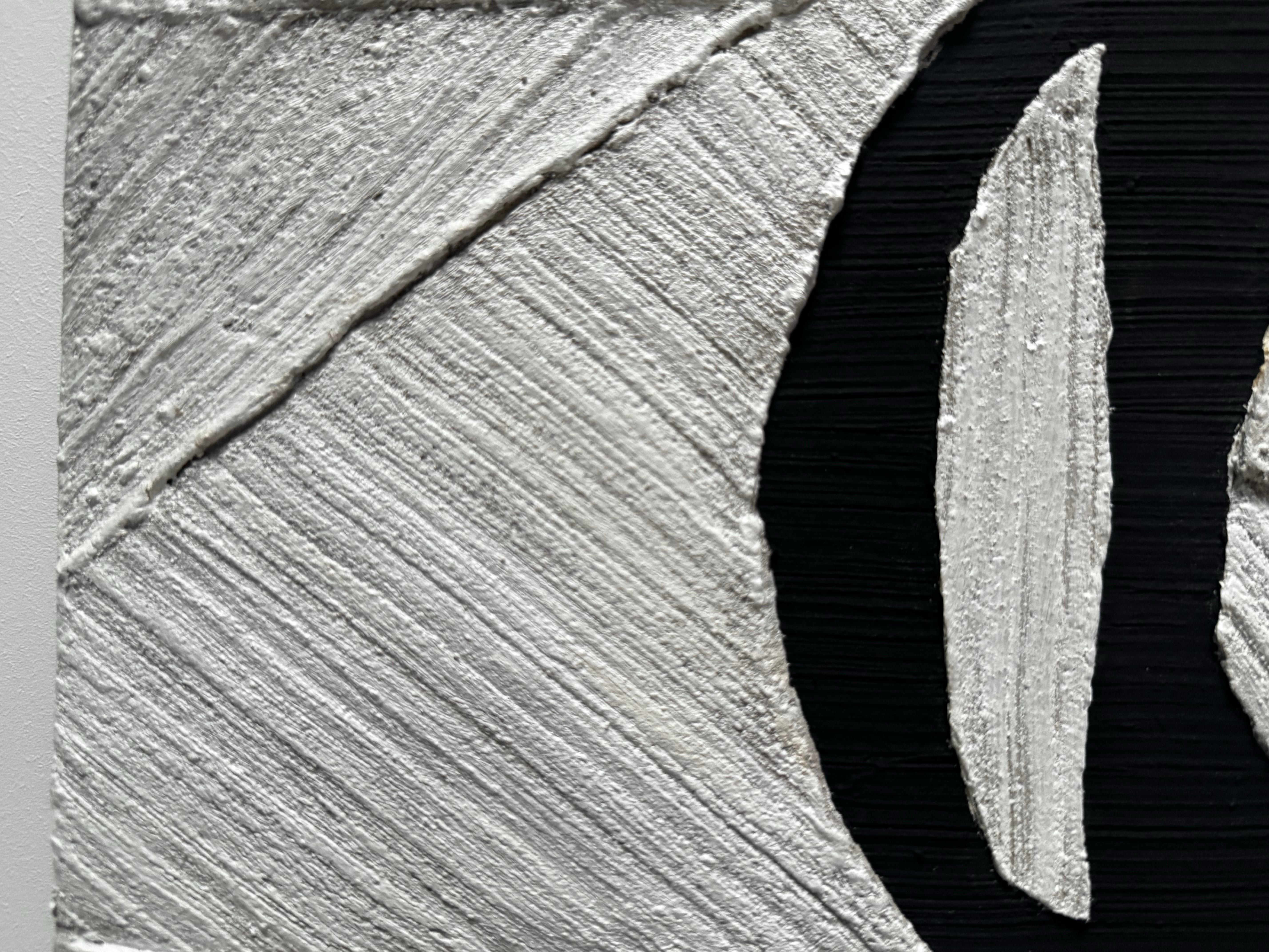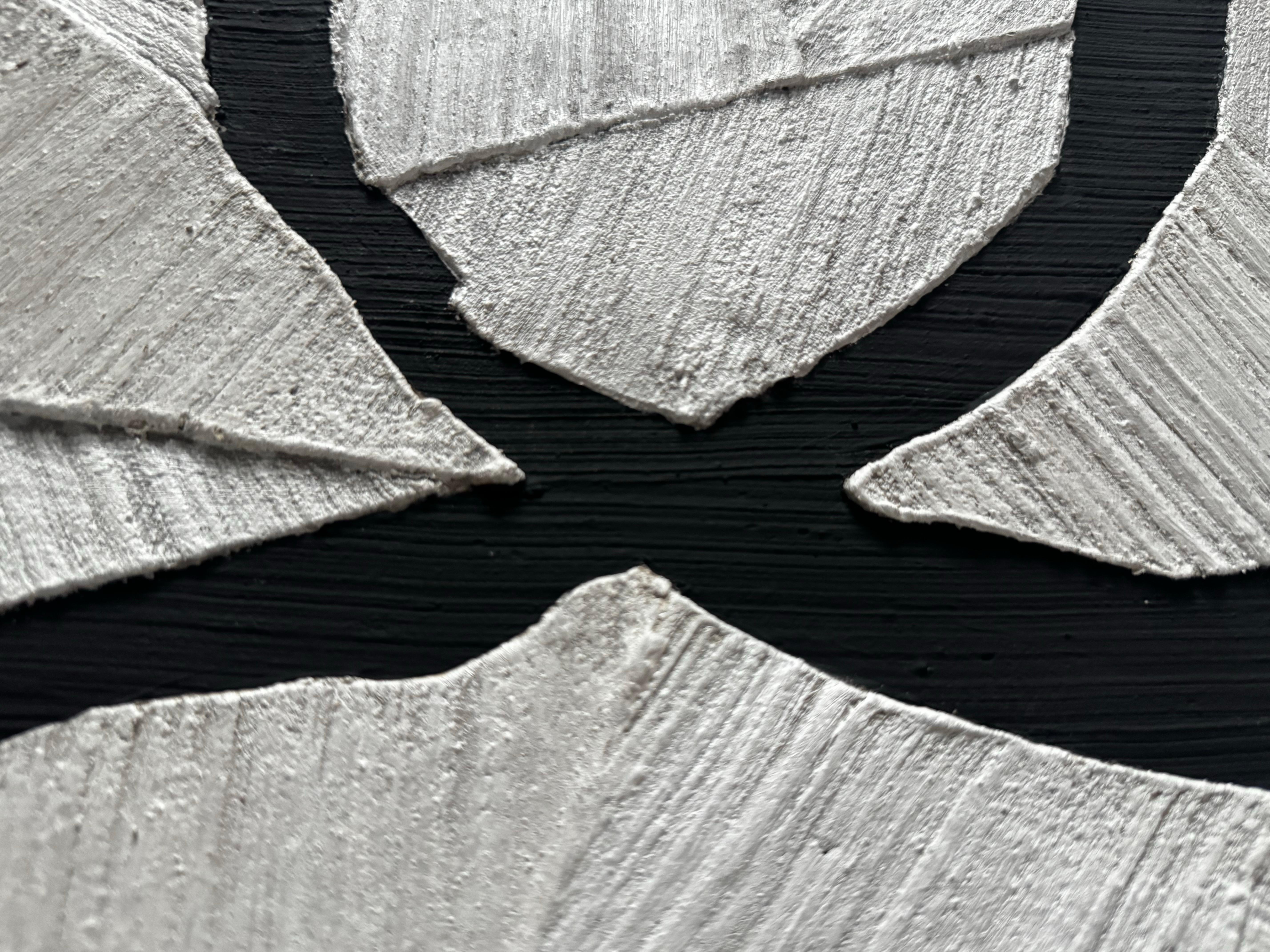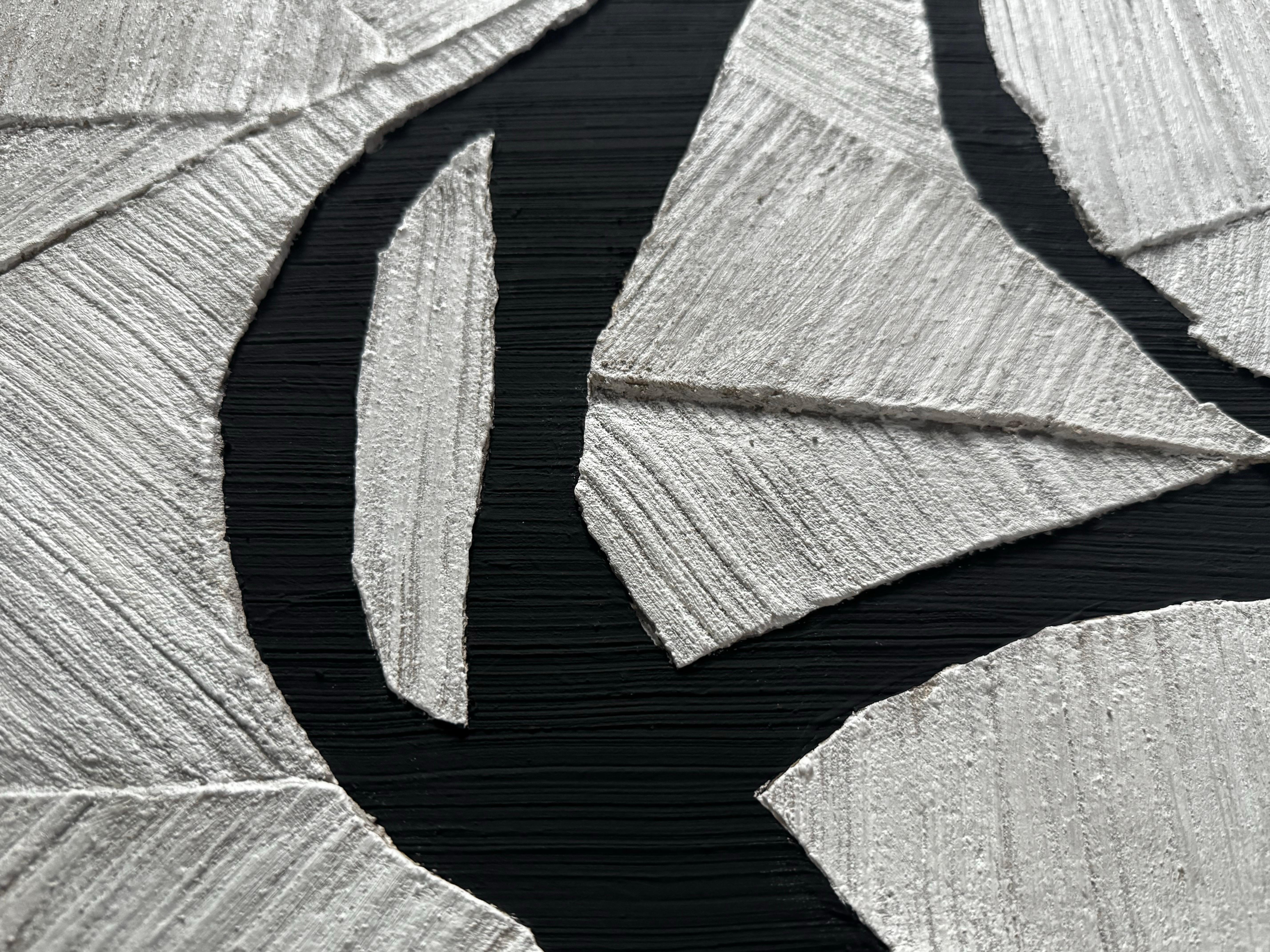 Текстурная картина с эффектом мозаики. Деревянный артборд, текстурная паста, акрил, матовое покрытие. Поверхность — матовая, цвет — серый, черный.