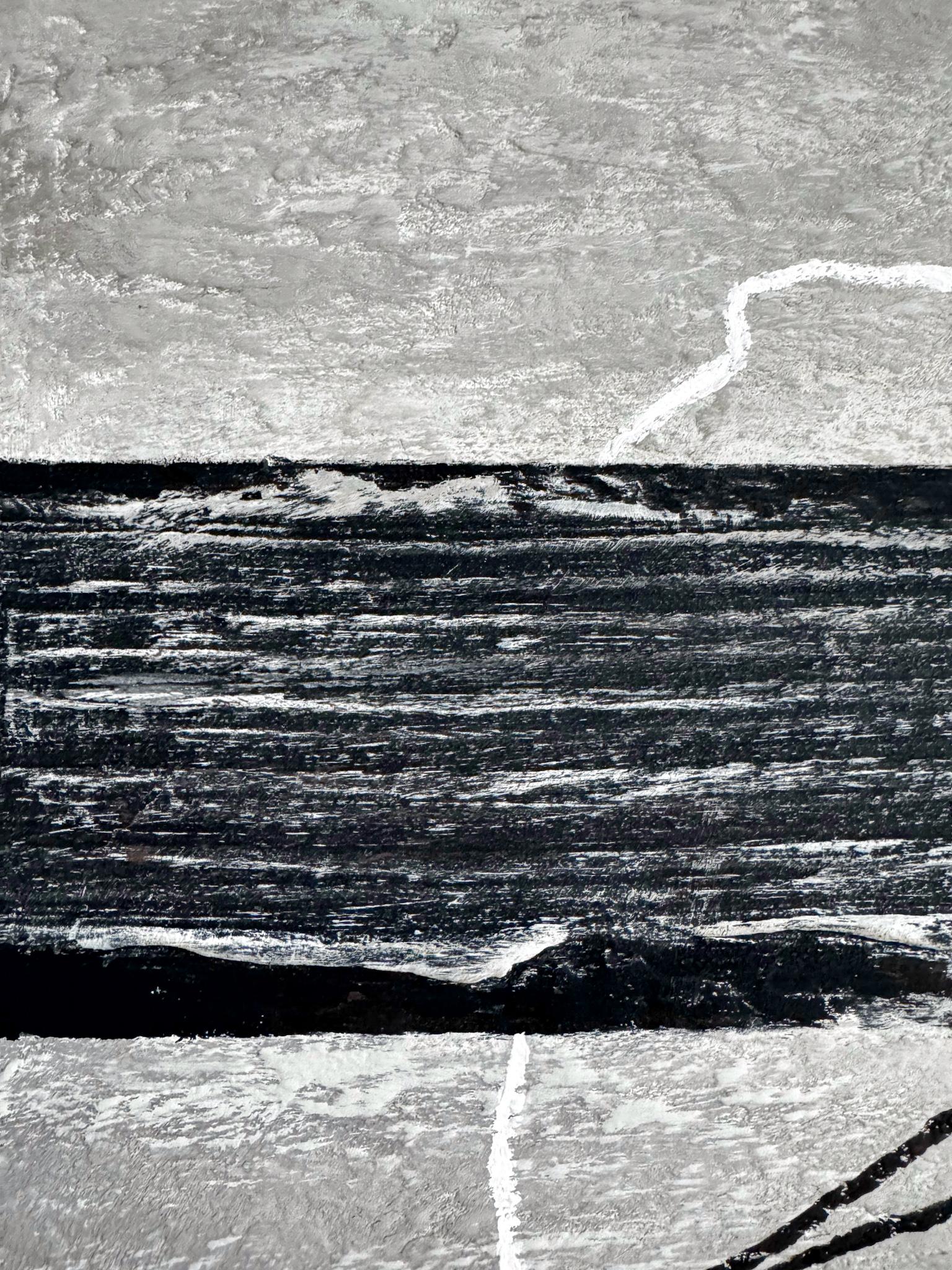 Текстурная картина с эффектом многослойного объема. Холст ручной работы, текстурная паста, акрил, глянцевое финишное покрытие. Поверхность — глянцевая, цвет — серый, черный. белый.